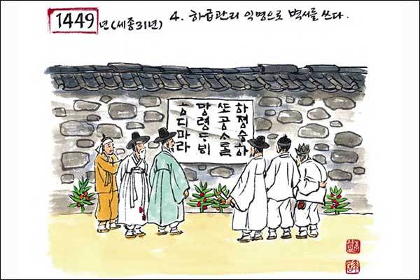 그러던 어느 날 어떤 사람이 벽에다 한글로 ‘하 정승아, 또 공사를 망령되게 하지 마라.’라고 써 놓았다. 이 벽서를 쓴 사람은 하급 관리일 것이다. 세종이 가장 먼저 한글 교육을 시킨 대상이 하급 관리였으며, 잘못된 정책으로 가장 먼저 피해를 보는 사람도 하급 관리였기 때문이다. 이 벽서 사건은 백성 누구나 생각을 적어 알릴 수 있게 되었고, 백성과 관료, 백성과 백성 사이에 자기 생각을 소통시킬 수 있게 되었음을 보여주는 역사적 사건이다.