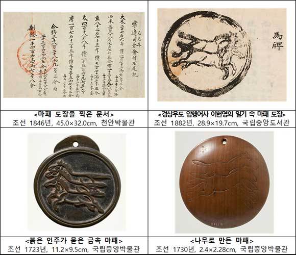 특별전에서는 <붉은 인주가 묻은 마패>, <암행어사가 마패를 찍은 문서> 등 여러 전시품에서 ‘말’을 살펴볼 수 있는데, 특히 암행어사의 상징처럼 여겨졌던 ‘마패’가 눈길을 끈다. 마패는 조선시대 출장을 떠나는 관원이 역참(驛站)에서 말을 이용할 수 있도록 발급한 증표다. 말 한 마리를 새긴 일마패(一馬牌)부터 다섯 마리를 새긴 오마패(五馬牌)까지 다섯 종류가 있었으며, 18세기 초 전국에 유통된 마패의 수는 670개에 달했다.