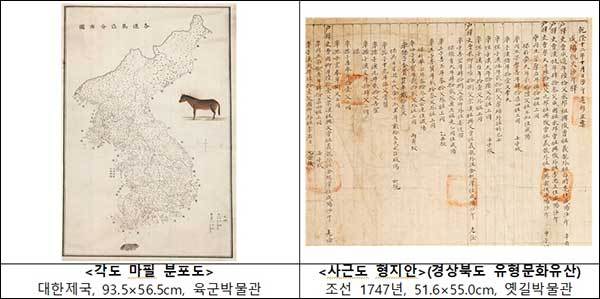 또 역참제도*와 관련한 문화유산도 흥미롭다. 전국 각지의 말 분포 정보를 표시한 <각도 마필 분포도>를 비롯해, 경상도의 주요 역참 현황을 자세하게 기록한 <사근도 형지안>(경상북도 유형문화유산)도 살펴볼 수 있다.