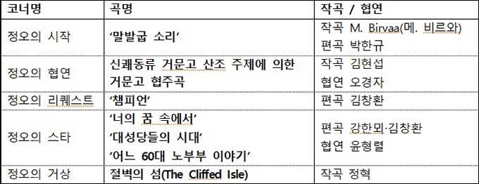 관객의 사연과 신청곡을 받아 국악관현악으로 연주하는 ‘정오의 리퀘스트’ 꼭지에서는 중년에 접어든 사연자가 올해 고3을 마친 아들에게 수고했다는 격려와 응원을 담아 신청한 싸이의 ‘챔피언’을 국악관현악으로 편곡해 연주한다. 사연이 뽑힌 관객에게는 해당 공연 초대 입장권을 주고 있다.