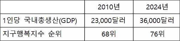 위 표를 보면 우리나라의 국민총생산은 2010년부터 14년 동안 크게 늘었지만, 지구행복지수는 오히려 추락하였다. 우리나라의 행복지수가 하락한 원인으로서는 과도한 경쟁과 외로움, 자살 증가가 지적되었다.