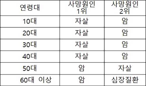 행복한 사람이 자살할 리는 없을 것이다. 우리나라의 청년층과 중년층의 사망원인 1순위가 모두 자살이라는 사실은 매우 충격적이다. 특히 40대에서는 통계 작성 이래 처음으로 자살이 암을 제치고 자살 원인 1순위로 나타났다.
