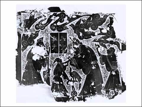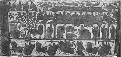 ○ 하단 : 화려한 마차와 수레 행렬이 무덤 주인의 권위와 신분을 상징한다.