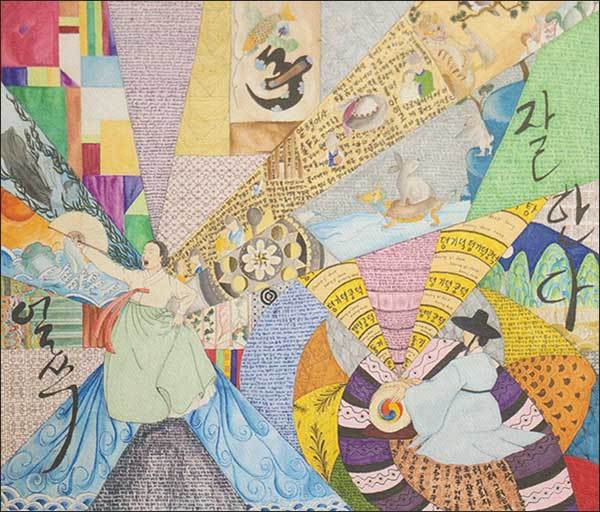 윤혜정 작가의 ‘내 형’에서는 곰 인형을 써서 따뜻한 형의 마음을 표현했으며, 미국인 유메기 작가의 ‘큰소리 판소리’는 화폭 가득 아주 작은 한글로 가득 메꾸고, 판소리 수궁가의 토끼와 거북이 그림 그리고 북을 치는 고수와 민화는 물론 ‘잘한다’와 ‘얼쑤’ 같은 추임새를 요소요소에 자리 잡게 한 엄청난 노력을 동반한 그림이었다.