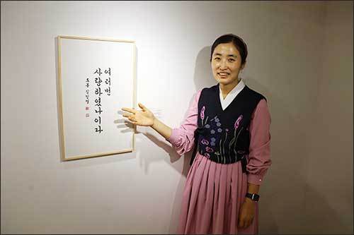 작품을 돌아보면서 한 작품, 한 작품에 빠져 들어간다. 한지에 먹으로 쓴 김선영 작가의 ‘나와 아이와 또 아이’에선 자아 속에서 아이와 또 하나의 아이를 보는 심오한 시각이 보이고, 묵지에 금묵으로 쓴 서민정 작가의 ‘흥’에서는 아름다움과 함께 힘찬 느낌을 볼 수 있었다. 윤지숙 작가의 ‘노래방’에서는 검은 글씨 안에 아름다운 자게로 촘촘히 박아 전통무늬로 디자인했는데 큰 노력을 기울였음을 알 수 있었다.
