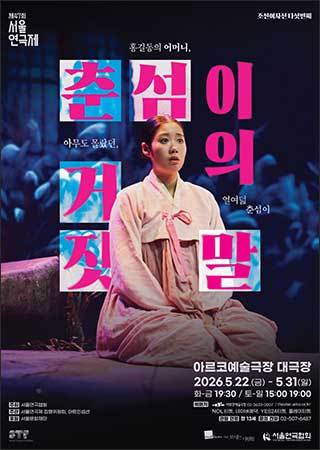 제47회 서울연극제 공식선정작 〈춘섬이의 거짓말〉은 연극을 사랑하는 관객은 물론, 고전을 새로운 시각으로 바라보고자 하는 교육·문화예술 관계자들에게도 강력히 추천되는 작품이다. 2026년 5월 22일(금)부터 5월 31일(일)까지 아르코예술극장 대극장에서 공연되며, 13살 이상 관람할 수 있다. 입장권 값은 전석 4만 원이며, 4월 20일까지 예매하는 모든 관객에게 ‘조기예매 40% 에누리’가 제공된다. 예매는 아르코예술극장(https://theater.arko.or.kr/), NOL티켓, 예스24, 네이버예약, 플레이티켓에서 할 수 있다.