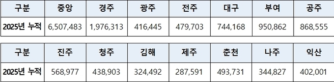 전국의 국립 소속박물관 동반 성장도 두드러진다. 2025년 누적 관람객은 국립경주박물관 1,976,313명, 국립부여박물관 950,862명, 국립공주박물관 868,555명으로 집계됐다. 국립경주박물관은 APEC 정상회의 계기로 마련한 특별전 ‘신라 금관, 권력과 위신’의 흥행으로 지난해 약 200만 명에 가까운 관람객을 모았고, 국립부여박물관과 국립공주박물관도 백제 문화권을 대표하는 박물관으로서 위상을 굳히고 있다.