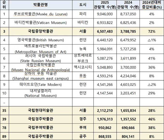 [우리문화신문=한성훈 기자] 국립중앙박물관(관장 유홍준)은 미술 전문 매체 ‘아트뉴스페이퍼(The Art Newspaper)’가 지난 3월 31일 발표한 ‘2025년 세계 박물관 관람객 조사’에서 세계 3위를 기록했다. 국립중앙박물관의 2025년 연간 관람객 수는 6,507,483명으로, 루브르 박물관(9,046,000명), 바티칸 박물관(6,933,822명)에 이어 전 세계 박물관 중 세 번째로 높은 수치다. 특히 영국박물관(6,440,120명), 뉴욕 메트로폴리탄 미술관(5,984,091명) 등 세계 유수의 기관을 제치고 거둔 성과로, 이는 한국 문화유산에 대한 나라 안팎의 높은 관심과 위상을 보여준다.