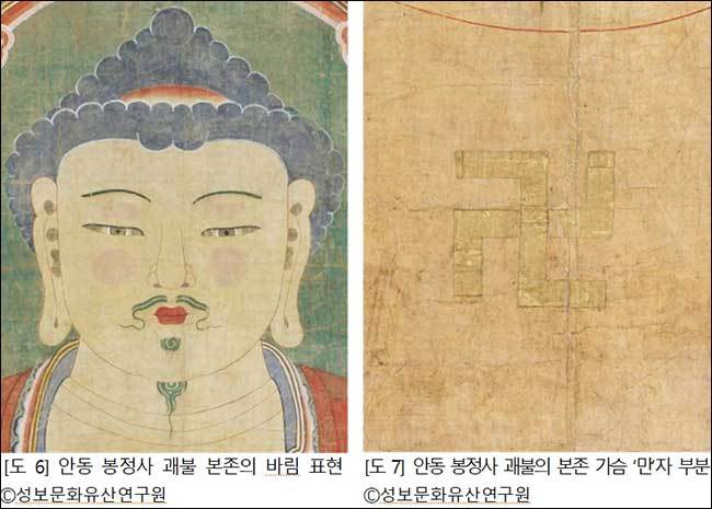 또한 부처의 가슴에는 금속 특유의 광택을 활용한 금박의 ‘만(卍)’자 무늬를 붙여 평면적인 화면에 입체적 효과를 더하였다. 이러한 표현은 괘불의 장엄함을 극대화하는 장치로 <봉정사 괘불>에서만 확인되는 독창적인 요소이다.