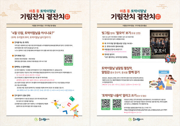 또한, 잔치 앞날인 4월 12일에는 영화 ‘말모이’ 함께보기(무료 상영회)가 열리며, 4월 한 달 동안 누리어울림마당(에스엔에스, SNS)를 통해 토박이말날을 알리는 ‘온(100) 마음’ 잔치도 펼쳐집니다.