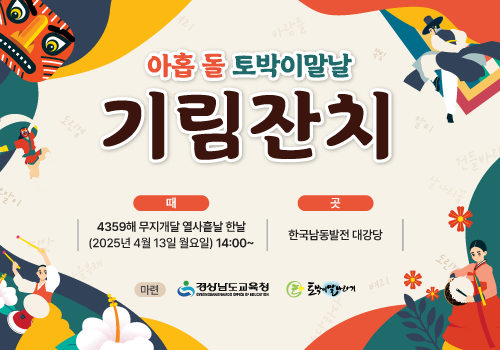 우리 겨레의 얼과 삶이 깃든 우리말, ‘토박이말’의 날을 기리는 아주 남다른 잔치가 참고을 진주에서 열립니다. 경상남도교육청과 사단법인 토박이말바라기가 함께 마련하고 진주교육지원청이 꾸리는 ‘아홉 돌 토박이말날 기림 잔치’는 토박이말의 값어치를 되새기고 온 나라에 토박이말 사랑의 바람을 일으키기 위해 마련하였습니다.