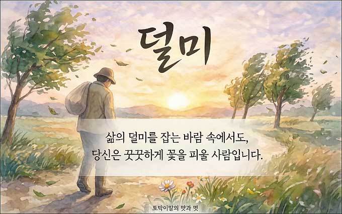 오늘 보내드리는 그림을 가만히 들여다보세요. 저 멀리 지평선 너머로 희망찬 아침 해가 떠오르는데, 우리네 삶을 상징하는 농부의 등은 거센 바람에 조금 굽어 있습니다. 흩날리는 나뭇잎들이 마치 우리의 발걸음을 자꾸만 뒤로 당기는 '덜미'처럼 느껴지기도 합니다. 하지만 그 바람 속에서도 묵묵히 길을 걷는 저 뒷모습이 참으로 눈물겹고도 든든하지 않나요? 오늘 우리는 이 그림 속 풍경을 닮은 토박이말 하나를 꺼내보려 합니다.