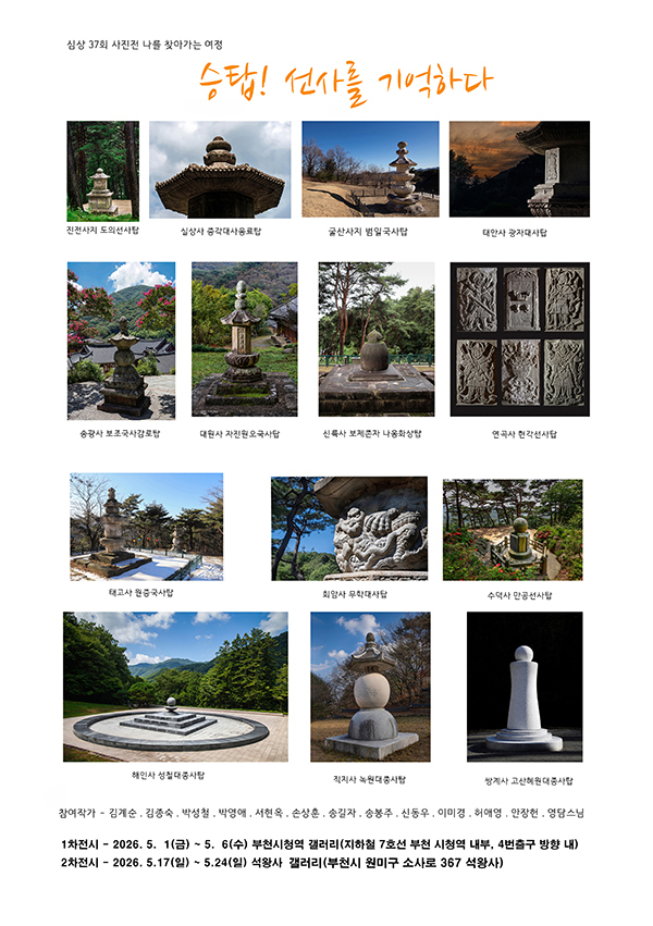 이러한 고승들의 승탑을 주제로 열리는 뜻깊은 전시회 <승탑, 선사를 기억하다> 가 5월 1일부터 6일까지 '심상 37회 사진전, 나를 찾아가는 여정'으로 부천시청역 갤러리에서 열릴예정이다.