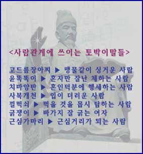 더러운 사람은 ‘사복개천’이지요.또 ‘껄떡쇠’가 있는데 이는 ‘먹을 것을 몹시 탐하는 사람’이며, 잔소리를 귀찮게 늘어놓는 사람이나 바가지를 자주 긁어대는 여자는 ‘긁쟁이’이고, 근심거리가 되는 일 또는 사람을 ‘근심가마리’로 부릅니다. 세력 있는 사람의 주위에서 총기를 어지럽히는 사람은 ‘해가림’으로 불러주면 좋겠습니다.