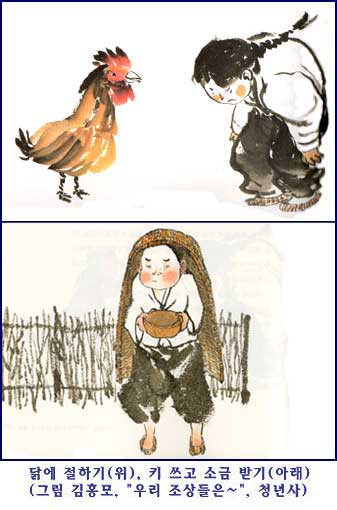 컸습니다.그래서 밤똥 누는 아이에게는 횃대에 앉은 닭에게 절을 해서 팔도록 했습니다. 밤에 똥을 누는 것은 닭보다 못하다는 얘기로 그러면 밤똥을 누지 않는다고 믿었습니다. 또 오줌싸개에게는 키를 쓰고 이웃집에 소금을 얻으러 보냈습니다. 그러면 이웃집 아주머니는 “다시는 오줌을 싸지 마라.”는 말과 함께 소금을 냅다 키에 뿌리며 놀라게 합니다. 키는 곡식의 불순물을 골라내는 도구로 아이의 오줌싸는 버릇을 그처럼 날려보낸다는 믿음이 있었던 것은 아닐까요? 그런 우리 옛날 세시풍속이 그립습니다.