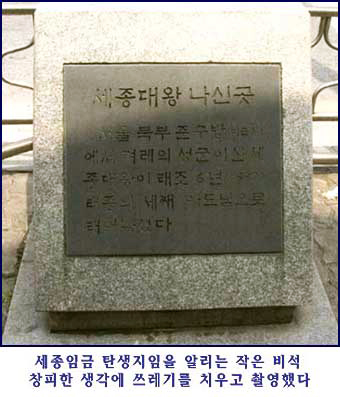 한글의 위상이 어느 정도인지 말해주는 듯합니다. 세종임금은 1397년 5월 15일 경복궁 옆 준수방 곧 태종(당시 왕자 이방원)의 집에서 태어났습니다. 세계 어디든 웬만한 위인이면 생가를 복원한다고 아우성이지만 세종임금은 작은 비석 하나만 길가에 뎅그러니 서 있습니다. 그 비석엔 커피가 남은 종이컵과 쓰레기봉투들이 둘러싸여 있던 것을 보았습니다. 어떻게 해야 할까요?