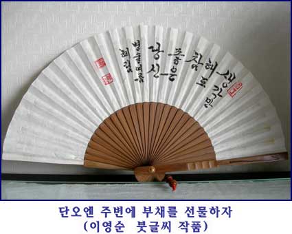 그리고 창포주 등의 약주를 마셔 재액을 예방하려 하였지요. 또 조선의 풍속에는, 단옷날에 임금을 가까이 모시던 여러 신하가 시를 기록한 단오첩(端午帖)을 써서 대궐 기둥에 붙였습니다. 그리고 해마다 이 날에는 공조(工曹)에서 부채를 만들어 임금께 진상(進上)하고 이 부채를 신하들에게 나눠 주었지요. 그렇게 한 까닭은 다가오는 여름에 더위 타지 말고 건강하라는 뜻이었습니다. 만일 주변에 사랑하는 사람이 있다면 단오엔 부채를 선물하면 어떨까요?