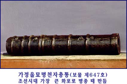 못했기 때문입니다. 하지만, 해전에서는 조선군이 연전연승하였는데, 이는 조선 수군이 거북선과 판옥선에 천 ‧ 지 ‧ 현 ‧ 황자총통 등 대형화포를 장착하여 싸웠기 때문이지요. 조선의 대형 화포는 원거리에서 적선을 격파할 수 있을 정도로 우수한 성능을 지녔던 것입니다. 당시 중소형선과 조총을 중심으로 하여 뱃전을 붙이고 백병전을 편 일본 수군이 조선 수군의 적수가 되지 못했습니다. 뛰어나 장수 이순신과 함께 대형화포의 위력이 나라를 구한 것입니다.