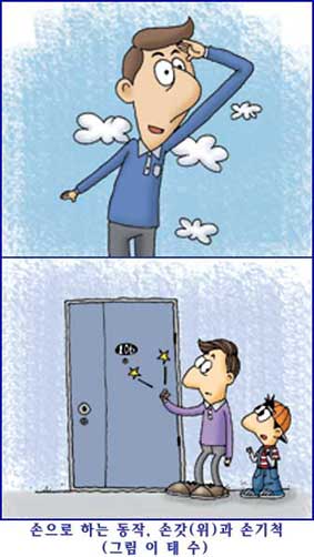 있습니다.그런가 하면 ‘손기척’도 있습니다. ‘손기척’은 흔히 쓰는 영어 ‘노크(knock)’의 토박이말입니다. 방에 들어가기 전에 방 안에 들어간다는 기척을 하는 우리나라의 전통적인 방법은 “에헴” 하는 헛기침입니다. 일상의 삶의 공간이 열려 있었던 구조 때문이었지요. 하지만, 생활공간이 꽁꽁 닫혀있는 요즘의 일상생활에서는 ‘손기척’을 안 할 수가 없습니다. “저 인간은 든버릇처럼 ‘손기척’도 없이 내 방문을 벌컥 열어젖히곤 한다.”라고 표현합니다. ‘손갓’과 ‘손기척’ 모두 살려 써야 할 말일 것입니다.