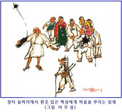 모피가 붙은 장의를 입었고, 머리엔 금과 은으로 장식한 모자를 썼다.”이를 보면 우리 겨레가 흰옷을 좋아한 것은 오랜 역사를 가지고 있습니다. 이렇게 흰옷을 좋아했던 우리 겨레는 일제강점기 당시 장터 들머리에 먹물을 담은 솥을 걸어놓고 흰옷을 입은 사람들에게 끼얹기도 했지만 흰옷을 입으려는 배달겨레의 생각은 꺾을 수가 없었지요.