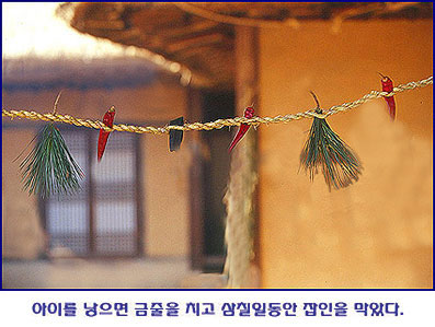 알리고 액을 막기 위하여 금줄을 쳐 두는데 이 기간 동안에는 상을 당하는 등