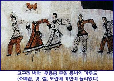 선을 둘렀지만 나중에는 점차 장식으로 바뀌어갔습니다.고구려 벽화 무용총 주실 동벽의 가무도에서도 확인할 수 있지만 조선시대 사대부가 평상시에 입는 옷인 편복에도 깃·도련·소매 끝에 선을 둘렀고, 학창의·중단·적의에도 가선이 있고, 여기에 무늬를 넣기도 했습니다. 깃·끝동·겨드랑이·고름 등을 색헝겊으로 대는 회장저고리에도 가선의 풍습이 남아 있는데 이러한 가선의 풍습은 상고시대부터 조선시대까지 주로 예복에 쓰였습니다.