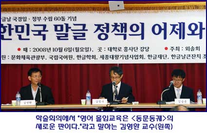 해방 뒤 각 정부로 나눠서 해당 시대의 말글 정책을 분석했습니다. 발표자 가운데 부경대학교 김영환 교수는 최만리의 상소문에서의 “이제 동문동궤의 시기를 당하여~”를 예를 들면서 “<동문동궤(同文同軌)>는 중국 중심의 사대교린의 다른 말이기도 하다. 미국말을 공용어로 삼자는 말이나 영어 몰입교육을 주장하는 것은 <동문동궤>의 새로운 판이라고 할 수 있다.”라고 주장했습니다. <동문동궤>는 ≪중용≫에 나오는 말로써 글쓰기에서 중국 각 지방의 서로 다른 글자의 형태를 통일하고 수레를 만드는 법식을 같게 한다는 말인데 중국 중심의 질서로부터 이탈한다는 뜻입니다.