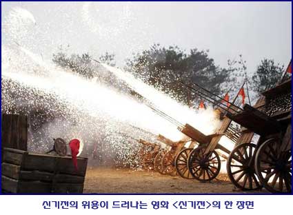 신기전은 자체 추진력으로 날아가므로 발사장치가 없어도 되지만 문종이 화차를 개발함으로써 발사각도와 방향을 정확히 잡게 되고 한 번에 많은 신기전을 발사할 수 있게 되어 신기전이 강력한 위력을 발휘할 수 있었습니다. 영화는 이 신기전을 바탕으로 허구를 보태 만든 것인데 가상이지만 명나라 10만 대군을 격파하는 장면은 참으로 통쾌합니다.