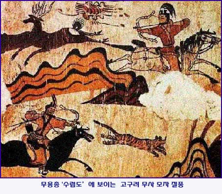 만들어 금은장식을 하여 “소이”라 하였다고 합니다.이러한 역사책들의 기록을 모아보면, 절풍·변·절풍변·절풍건·조우절풍·소골은 모두 비슷한 고깔 형태의 쓰개인데 고구려 고분벽화 감신총(龕神塚)·개마총(鎧馬塚)· 무용총(舞踊塚)·쌍영총(雙楹塚) 등에서 그 모습을 볼 수 있습니다.
