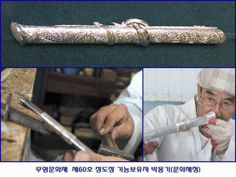 영주·울진 등이 장도를 만들기가 성행했지요.원래 장도는 도자장·소목장(小木匠)·조각장·백동장(白銅匠)이 칼집·칼날·칼자루를 나눠 만들고 장식을 하였지만, 요즘은 “장도장(粧刀匠)” 혼자서 아울러 만듭니다. “장도장”은 1978년 중요무형문화재 제60호로 지정되었으며, 현재 기능보유자는 광양 박용기 선생입니다. 박용기 선생은 14살 때부터 스승인 유명한 패도장 고 장익성으로부터 전수받았다고 합니다.