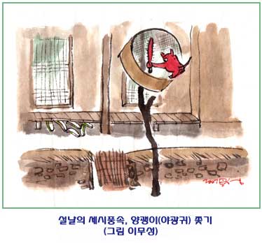 설날의 세시풍속에는 세주불온, 문안비, 청참, 오행점, 원일소발 따위의 재미있는 것들이 참 많습니다. 하지만, 요즘 사람들은 섣달 그믐날 밤에 잠을 자면 눈썹이 희어진다는 것을 빼고는 모두 잊었습니다. 눈썹이 희어지는 건 ‘해지킴’ 또는 '수세(守歲)한다'라고 했지요.