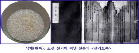 《산가요록(山家要錄)》에는 식혜의 종류를 무려 7가지나 소개했지요.물고기+쌀밥, 소금+끓인 소금물+밀가루가 재료인 어해(魚醢)와 소의 위+후추, 소금, 쌀밥, 누룩+꿩고기(닭고기)가 재료인 양해, 생돼지껍질+소금+쌀밥, 후추가루 +누룩이 재료인 저파식혜가 있습니다. 또 도라지+소금+쌀밥의 도라지식혜, 죽순+ 소금+쌀밥의 죽순식혜, 꿩+소금+밀가루의 꿩식혜, 쌀을 굵게 갈아 쑨 죽인 원미죽+ 물고기+소금의 원미식혜도 보이지요. 그로 미루어 보면 지금 일부 지역에서만 향토식품으로 남아 있지만 조선시대엔 보편적인 음식이었을 것으로 생각됩니다.