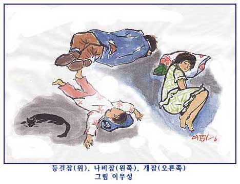 너무 피곤하여 아무 데서나 쓰러져 자는 잠을 말합니다. 잠 이름 가운데에는 잠자는 모습으로 지은 이름들도 있습니다. 우선 “괭이잠”은 깊이 들지 못하고 자주 깨면서 자는 잠인데 괭이는 고양이의 준말로 괭이가 자는 모습을 빗댔지요. “언제 떠날지 몰라 괭이잠을 잤더니 온종일 피곤하다.”처럼 씁니다. 또 “개잠”은 개처럼 머리와 팔다리를 오그리고 옆으로 누워 자는 잠이며, “나비잠”은 갓난아이가 두 팔을 머리 위로 벌리고 자는 잠, “갈치잠”은 비좁은 방에서 여럿이 모로(비껴서, 대각선으로) 끼어 자는 잠을 말합니다.