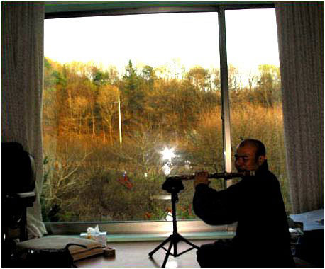 ▲ 큰 창을 통해 꽃과 산과 자연을 받아들이며 연주하는 이삼스님