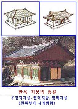 우리 전통한옥의 지붕에는 ‘맞배지붕’, ‘우진각지붕’, 팔작지붕‘의 3가지 기본형이 있습니다. 이중 ‘맞배지붕’은 책을 반쯤 펴놓은 것처럼 지붕의 앞면과 뒷면을 사람 인(人)자 모양으로 배를 맞댄 것인데 수덕사 대웅전에서 볼 수 있고, ‘우진각지붕’은 남대문처럼 맞배지붕의 양 옆면을 다시 세모꼴 모양으로 끌어내린 것을 말하며, 지붕 앞에서는 네모꼴로 옆에서는 세모꼴로 보입니다. 또 ‘팔작지붕’은 부석사 무량수전처럼 우진각지붕의 세모꼴 옆면에 다시 여덟 팔(八)자 모양을 덧붙여 마치 부챗살이 퍼지는 듯합니다.이 외에 창덕궁 애련정처럼 처마에서부터 가운데로 지붕이 모아지는 모임지붕(사모지붕, 육모지붕, 팔모지붕)과 통도사 대웅전과 같은 T자형지붕이 있고, 전주 송광사 범종루 같이 십자형지붕 등도 있습니다. 문화유산 답사를 할 때 이런 지식을 갖추고 보면 재미있을 것입니다.
