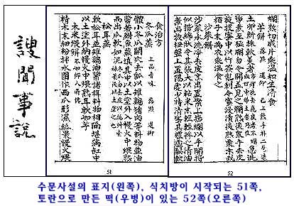 것인데 여기에 식치방(조리편)을 더했습니다. 특히 이 수문사설의 식치방이 돋보이는 것은 중국의 조리서를 인용하지 않고, 당시 솜씨 있는 여러 요리사의 비법을 수록한 것입니다. 박이돌(朴二乭)의 우병(芋餠), 돌이와 학득 (學得)의 황자계혼돈, 민계순의 종 차순의 붕어증 따위의 특이한 조리법을 소개합니다. 또 지방 특산물인 순창고추장, 송도식혜 등과 지은이가 실제로 경험한 외국 조리법인 베이징의 계단탕(鷄蛋湯), 일본의 생선묵과 비슷한 가마보곶(可麻甫串)의 요리법도 수록하였습니다. 수문사설의 식치방을 읽으면 전통음식의 본 모습을 알 수 있을 것입니다. 현재 국립중앙도서관과 서울시립종로도서관에 필사본이 있습니다.