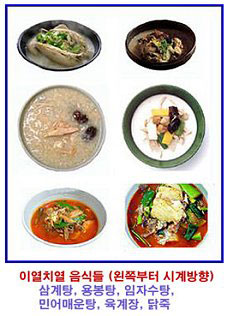 복날 음식에는 개장국(보신탕), 닭죽, 육개장, 임자수탕(영계를 곤 국물), 민어탕, 염소탕, 장어백숙, 용봉탕(잉어, 오골계, 인삼 등으로 만든 음식), 메밀수제비, 자라탕, 메기찜 등 이열치열 음식들이 참 많았습니다.