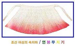비슷합니다. 이 무지기도 여러 가지가 있는데 특히 ‘연봉무지기’라는 것도 있습니다. ‘연봉무지기’는 연꽃의 빛깔처럼 끝을 물들인 여자의 속치마로 치마단을 주름을 잡아 5단이나 7단으로 이은 것과 1단만을 붙인 것이 있지요. 예장(禮裝:위엄 있는 몸가짐이나 차림새를 갖추기 위한 예복)할 때 허리에서부터 아래가 퍼지도록 하기 위하여 이 ‘연봉무지기’를 입고 겉치마를 입어 옷맵시를 한층 더 살아나게 했습니다. 조선여성의 아름다움은 이 연봉무지기에도 있었습니다.
