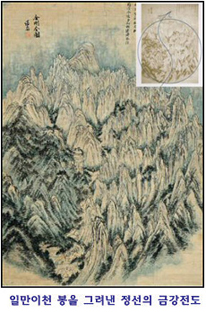금강산의 봉우리는 일만 이천 개라고 합니다. 그런데 이 많은 봉우리를 한 장의 그림에 다 담아낼 수가 있을까요? 그런데 조선 후기의 화가 겸재 정선(鄭敾, 1676∼1759)은 ‘금강전도’에서 이를 실현했습니다. 겸재는 우리나라의 산천을 독자적 화법으로 그려내어 진경산수화풍을 확립시킨 동시에 진경산수화의 발달에 지대한 공로를 남겼는데 특히 평생 여러 차례 금강산 일대를 유람하였고, 100여 폭에 이르는 금강산 그림을 그렸다고 합니다.“‘금강전도’를 보면 한가운데 만폭동 계곡을 중심으로 하여 장경봉에서 비로봉까지 남북으로 길게 S자로 휘어진 선은 영락없는 태극을 그린 것이다. 태극은 무한한 공간과 영원한 시간을 뜻하는 동시에 혼돈에서 질서로 가는 첫걸음을 뜻한다. 금강산이 우주의 원리인 태극으로 승화한 것이다.” 사계절출판사에서 펴낸 책 ‘한국생활사박물관’ 9권에 나오는 글입니다.