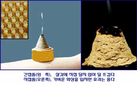 뜸은 쑥을 살갗 위에 직접 놓고 태워 섭씨 약 60∼70° 도의 가벼운 화상으로 경혈을 자극해 증상을 가라앉히는 작용을 합니다. 하지만, 뜸이 무조건 뜨거워야만 효과가 있는 것이 아니라 적당한 크기, 열이 필요하고, 적절한 경혈자리를 찾아 뜨는 것이 중요할 것입니다. 뜸의 효과는 신경통이나, 관절염, 타박상 따위의 통증이 가라앉고, 염증을 삭이는 효과가 있다고 합니다. 또 속을 따뜻하게 하여 냉증을 없앤다고 하며, 기혈이 잘 통하게 되어 신경마비, 운동기능장애 등에 좋다고 전해집니다.뜸의 장점은 한의사의 지도를 한번 받고 나면 한의원에 가지 않고, 집에서 편리한 시간에 스스로 할 수도 있으며, 부작용이 없고, 값이 싸다는 것입니다. 하지만, 뜸은 오랫동안 해야 효과가 난다는 것을 잊어서는 안 됩니다. 요즘은 쑥을 담배처럼 피워서 뜸을 대신하며, 담배를 끊게 하는 제품도 나옵니다.