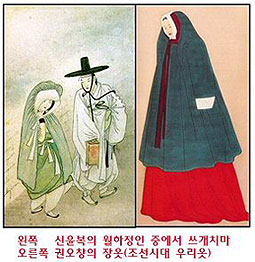 이슬람교도인 아랍 여인들은 다른 사람에게 얼굴을 보이지 않기 위하여 ‘차도르’를 씁니다. 그 중에는 머리 전체를 모두 싸매고 눈 부분만 레이스를 대 겨우 앞을 볼 수 있는 것도 있지요. 그런 것이 바로 우리 조선시대에도 있었습니다. 조선시대 여성은 나들이할 때 장옷이나 쓰개치마, 너울 따위를 뒤집어쓰고 얼굴이 보이지 않게 했습니다. 장옷은 남자 두루마기와 비슷한 모양입니다. 바탕은 주로 초록색 명주였고, 소매 아래에는 흰색 옷감을, 겨드랑이와 옷고름, 깃은 보라색 옷감을 댑니다. 쓰개치마는 보통 치마와 비슷한데 폭과 길이가 짧고, 흰 모시로 만든 것입니다. 너울은 삿갓 테두리에 얇은 옷감을 대어 허리까지 드리우는 것입니다. 두꺼운 옷감을 대면 눈앞에만 얇은 옷감을 대어 밖을 볼 수 있게 합니다. 양반 규수들은 이 규범을 엄격하게 지켜야 했습니다.