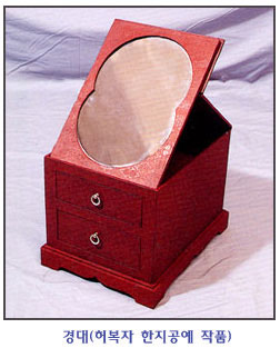 경대는 조선시대 여인들이 화장하거나 머리를 빗을 때 쓰는 거울을 세우는 대(臺)입니다. 각종 화장품 및 빗, 비녀, 족집게, 장신구를 비롯하여 각종 화장도구와 손수건, 실 등을 담아두는 저장 용구이자 화장할 때 사용하는 화장구이지요. 보통 경대는 아래에 여닫이문이 있고, 문을 열면 서랍이 서너 개 있는 작은 직육면체로, 뒤에는 거울이 달려있어 뚜껑을 열어젖혀 비스듬히 세워 사용한 후 거울을 뒤집어 넣으면 작은 상자가 되는 구조입니다. 경대의 재질은 주로 느티나무와 먹감나무를 많이 사용하였으며, 나무에 생칠을 하여 나무결을 살린 것, 홍칠을 한 것, 나전무늬 놓은 것 따위가 있습니다. 무늬는 동그라미 안에 수(壽)라는 글자를 넣은 것, 당초 무늬, 수복 글자를 새긴 것, 쌍학 그림 따위를 즐겨 썼습니다. 조선시대 여인뿐 아니라 상투를 튼 남자들도 긴 머리를 다듬기 위해 경대를 쓰기도 했지요.
