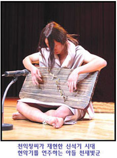 신석기 시대에도 악기가 있었을까요? 토우(土偶:흙으로 만든 사람이나 동물의 상)를 보고 신석기 시대의 현악기를 재현한 사람이 있습니다. 30년 이상 가야금의 개량에 몸바쳐온 천익창 씨가 그입니다. 그는 신라금도 재현한 바가 있는데 그 과정에서 전국의 박물관을 수없이 돌며 토우를 연구했다고 합니다. 그런데 국립경주박물관에서 가슴에 널빤지 같은 것을 안고 있는 '사람모양 토우'를 보고 박물관의 학예연구관들에게 물었는데 아무도 그것이 무엇인지 몰랐습니다. 그는 가야금을 연구하는 사람이었기에 그것이 악기임을 직감했다고 합니다. 하지만, 그 널빤지는 가야금에 있는 줄이나 안족이 없었습니다. 그래서 그 토우를 직접 만들어보고, 줄을 끼어 보며, 안족을 대 보고 확신을 했습니다. 그래서 신석기 시대의 가야금을 재현한 끝에 지난 1월 28일 국립민속박물관 대강당에서 재현 연주를 했습니다.