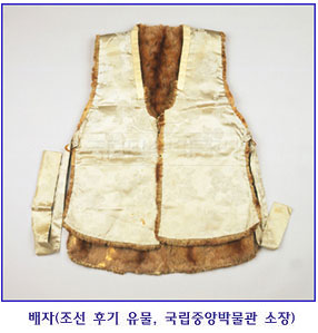 전통한복 중의 하나인 배자(褙子/背子)는 저고리 위에 덧입는 소매 없는 웃옷입니다. 배자는 소매와 섶, 고름이 없고 깃은 좌우 모양이 같으며 겹쳐져 여미는 것이 아니라 마주 닿게 입는 옷이지요. 통일신라시대의 반비(半臂), 배당과 조선시대의 답호, 쾌자, 전복, 더그레 따위도 모두 배자의 종류로 봅니다. 깃이 없는 마고자와 조끼는 조선 말기 이후에 우리나라에 들어와 토착화된 것인데 반해 배자는 오랫동안 우리 겨레가 입어온 옷입니다.
