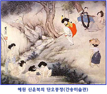 가고 저리 갈 제" 판소리 춘향가 중에서 춘향이가 그네 타는 장면입니다. 오늘은 예부터 설날, 한식, 한가위와 함께 4대 명절인 단오로 이날의 세시풍속으로는 남성들은 씨름을, 여성들은 그네를 즐겨 탔으며, 여성들은 창포물에 머리를 감았습니다. 또 올해도 더위를 타지 말고 건강하라는 뜻으로 부채를 선물하기도 합니다. 또 단오날 정오에 대추나무 가지를 치거나 가지 사이에 돌을 끼워 놓아 더 많은 열매가 열리기를 기원하는 "대추나무 시집 보내기" 풍습도 있었습니다.
