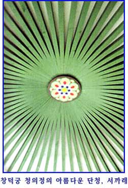 심어두고 그해 농사 작황을 가늠했다고 합니다. 그리고 그 논에서 베어낸 볏짚으로 지붕을 얹었다고 하지요.청의정 천장은 초가로 이은 동그란 모양을 하고 있으며, 정자 안쪽 가운데엔 연꽃무늬의 둥근 단청이 있습니다. 이 연꽃무늬는 잠시 팔각 모양의 서까래를 뻗었다가 네모진 정자 형태를 이루게 됩니다. 곧 원형-팔각-네모로 이어지는 형태를 띠게 되는데 원형은 하늘, 팔각은 사람, 네모는 땅을 뜻하는 것으로 우주의 기본 원리인 삼재(三才)를 표현한다고 합니다. 연꽃 단청과 연두색 서까래가 아름답지요?