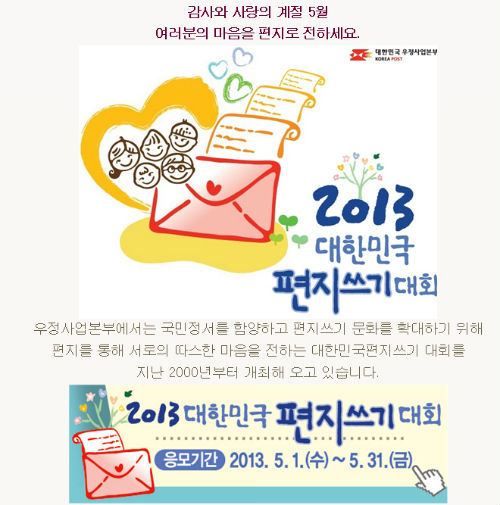 이렇듯 편지는 말로 다 하지 못하는 것을 살갑게 적어 상대의 마음을 어루만져 주는 사랑의 묘약이며 사람과 사람사이에 신뢰와 따스한 인정을 느끼게 해주는 상큼한 비타민이다. 이러한 마음의 정을 나누는 2013년 대한민국편지쓰기 대회가 5월 1일부터 31일까지 열린다. 가족간에, 사제지간에,친구간에 못나눈 이야기를 편지로 전해보면 어떨까? 거기에 상까지 탄다면 금상첨화 일 것이다.