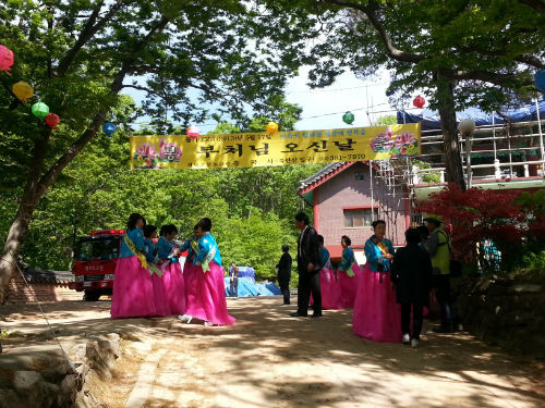 | ▲ 흥국사 절 입구에서 찾아오는 손님을 맞는 흥국사 합창단원들 | ||