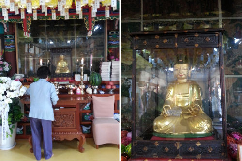 | ▲ 아미타여래좌상(경기문화재자료제104호)은 아주 작은 불상으로 유리관에 있어 사진이 얼비친다.(오른쪽) | ||