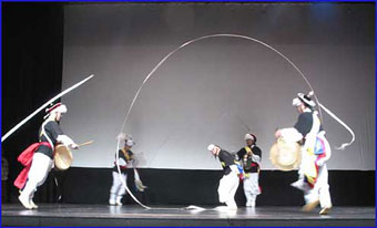 모습입니다. 북잽이가 긴 채를 감고 나온 뒤 청중들을 향해 힘껏 던집니다. 그러면